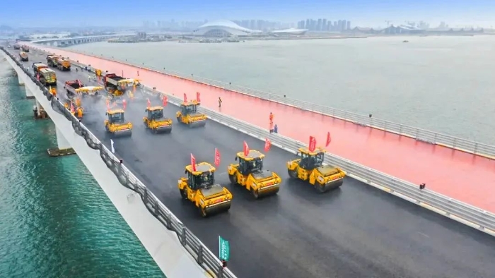 翔安大橋在建設(shè)中既要克服海上風(fēng)浪大、潮差高、巖層強(qiáng)度高、跨越生態(tài)保護(hù)區(qū)等困難,又要兼顧綠色環(huán)保;要在這種復(fù)雜的環(huán)境中保證施工質(zhì)量,對(duì)設(shè)備和施工技術(shù)的選擇就顯得尤為重要。徐工數(shù)字化智能施工集群憑借其智能化、高精度、高效率等顯著優(yōu)勢(shì),成功克服了傳統(tǒng)施工方式難以應(yīng)對(duì)的諸多難題,可精準(zhǔn)適配翔安大橋的橋面鋪裝工作。