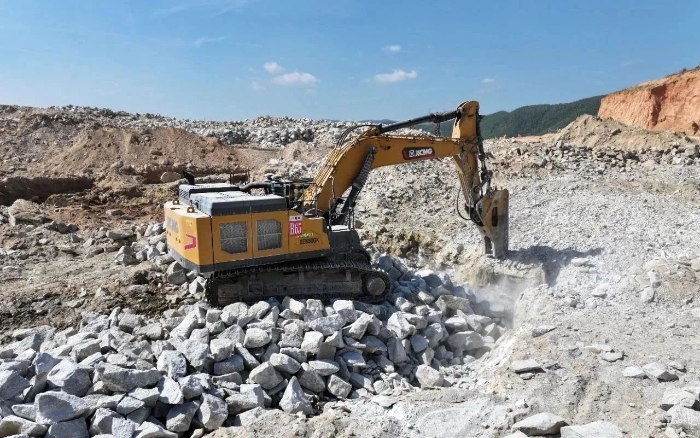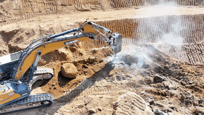 這邊巖石硬的很,后期破碎特別吃力,在徐工工作人員的推薦下,我們嘗試了徐工大噸位挖掘機,果真像雞蛋碰石頭,一碰就碎,于是后面我們陸陸續(xù)續(xù)都置換成了徐工。