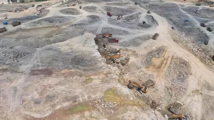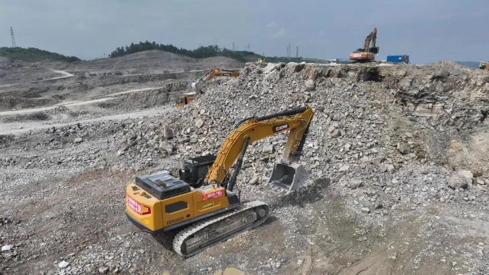 前期爆破剝離工序后,徐工20噸挖掘機(jī)搭配140的小破碎錘進(jìn)行二破,同時(shí)XE380GK、XE600GK等機(jī)型進(jìn)行挖裝作業(yè)?,F(xiàn)場共投入挖掘機(jī)50多臺,每天的挖方量在10萬方左右。