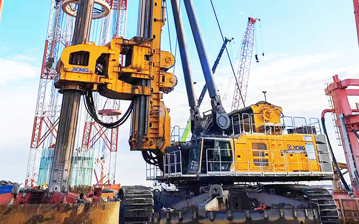 徐工XR1600E旋挖鉆機(jī)參建項目為世界上跨度最大的西堠門公鐵兩用跨海大橋,其中5號主塔墩基礎(chǔ)采用18根6.3m鉆孔灌注樁進(jìn)行承載。XR1600E旋挖鉆機(jī)需要在大風(fēng)、激流、裸巖、深水的復(fù)雜海洋環(huán)境下為這座超級跨海大橋進(jìn)行夯基,完成目前國內(nèi)最大直徑6.3m的鉆孔施工!