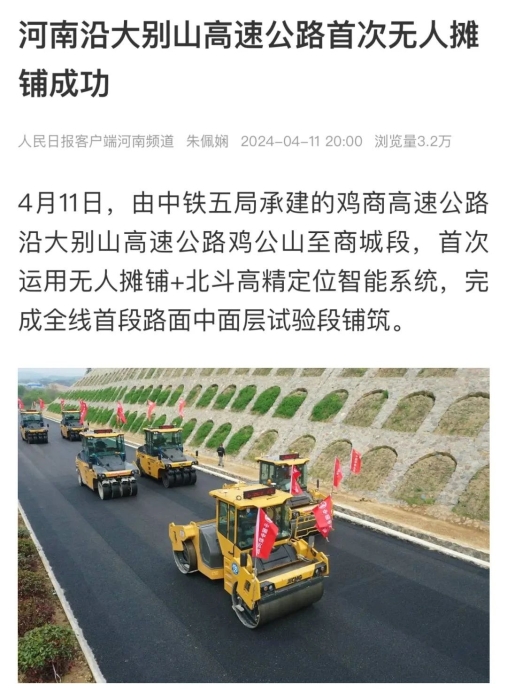 此次試驗(yàn)段是沿大別山高速公路雞公山至商城段JSSG-2標(biāo),首次運(yùn)用無人攤鋪+北斗高精定位智能系統(tǒng),完成全線首段路面中面層試驗(yàn)段鋪筑。
