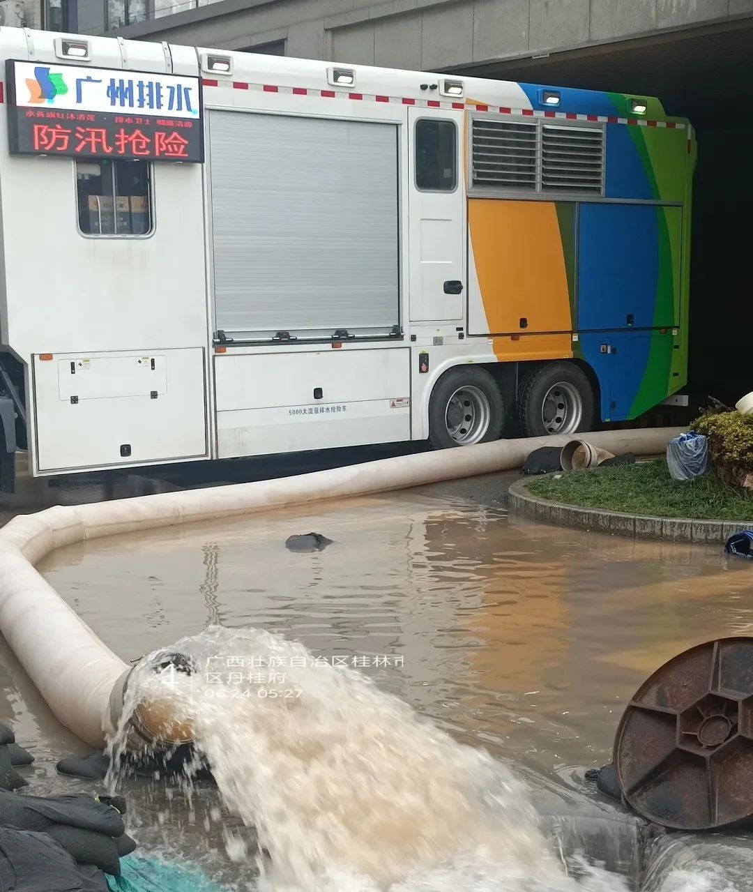 除桂林站地下停車場之外,徐工排澇產(chǎn)品還參與了桂林丹桂府小區(qū)以及大河圩旁的地下車庫內(nèi)澇救援任務(wù)。