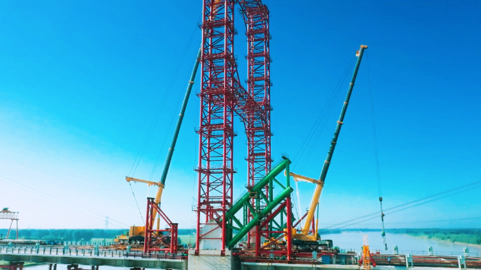 該黃河特大橋是目前國內(nèi)規(guī)模最大的下承式鋼管混凝土系桿拱橋,作為架起拱橋主拱圈“骨架”——拱肋的主力,徐工起重機是如何架起“彩虹”的呢?