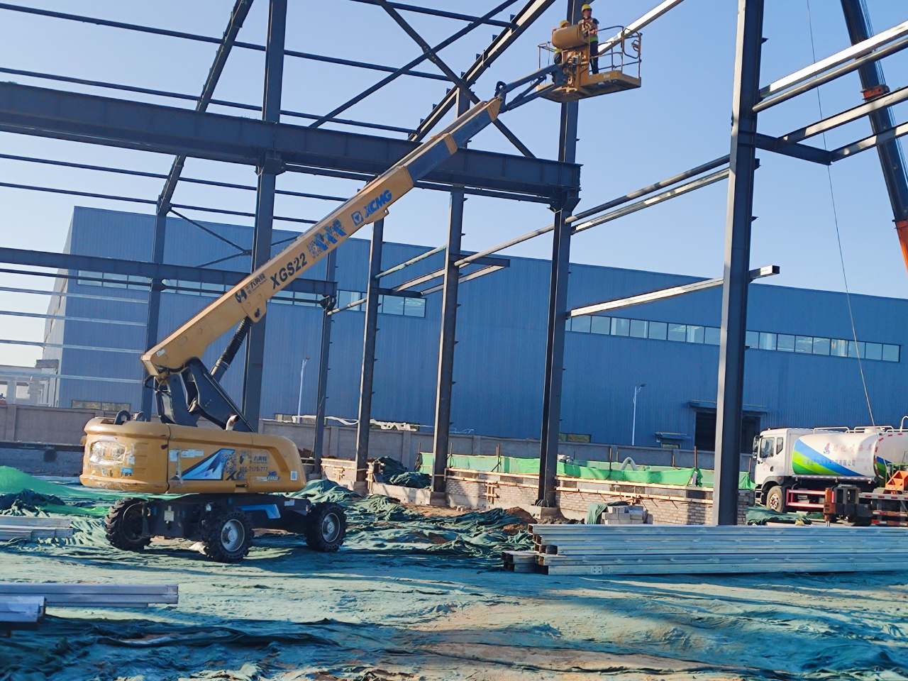 目前,徐工XGS22ACK-Li、XGS22K、XG1412HA等二十余臺設(shè)備正在此聯(lián)合作戰(zhàn),開展外立面鋼結(jié)構(gòu)安裝、外立面玻璃安裝以及室內(nèi)管道安裝等相關(guān)工作,為這所占地31萬平方米的綠色校園添磚加瓦。