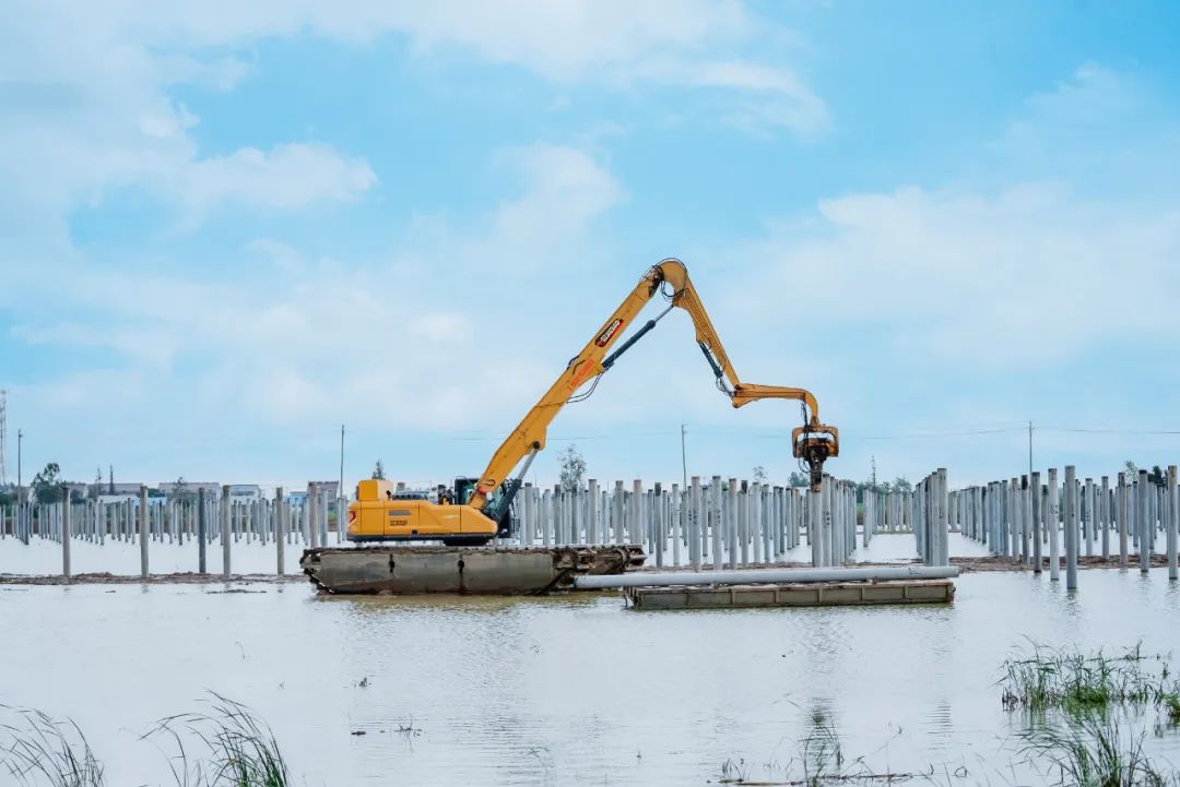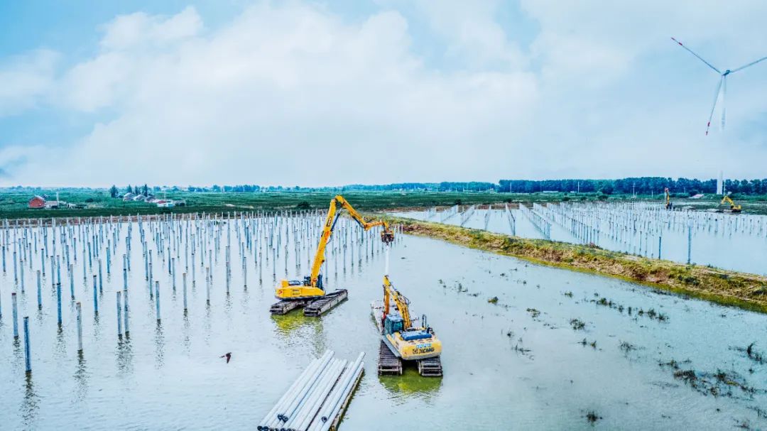 在漁業(yè)較為發(fā)達的濱海港鎮(zhèn),“漁光互補”光伏發(fā)電項目建設正如火如荼,項目現場,徐工水上打樁機的身影隨處可見。