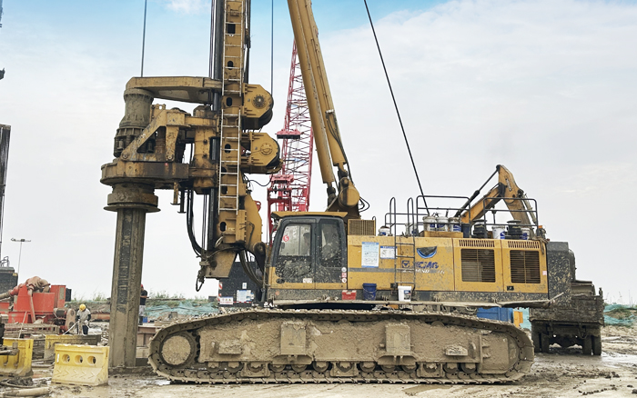 徐工XR550D、XR580HD等多臺徐工大噸位旋挖鉆機(jī)群憑借精湛的技術(shù)和卓越的性能,成功攻克了地層復(fù)雜、工期緊迫等多重難題,平均成孔周期68小時,全面提速大橋樁基礎(chǔ)建設(shè)。