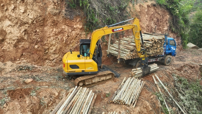 在鄭俊負責的林場,每節(jié)木材長度2.6米,徐工XE85GF一次可以夾10節(jié)以上的木材,重量超過1噸,而之前的輪挖夾裝0.6噸木材已是極限。