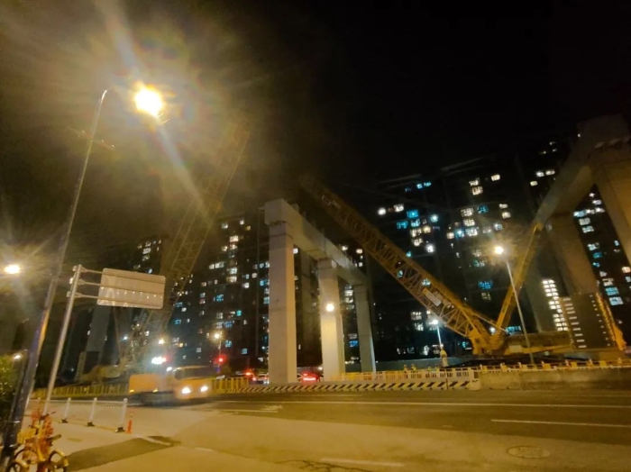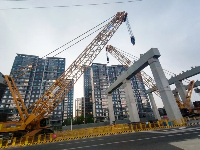 狹窄空間內,兩機協(xié)同微調,在進行精確轉場移動的同時,也避免了任何晃動或扭轉,重物分毫不差地平穩(wěn)落位至預定橋墩支座上,整個過程高效流暢,一氣呵成。