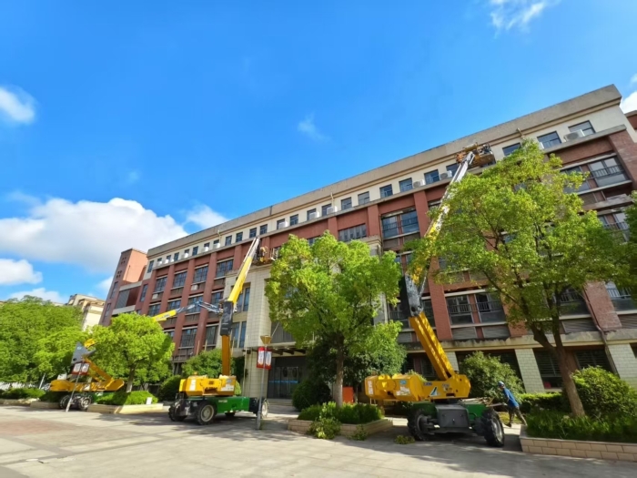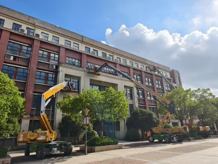 此次施工通過使用徐工高空作業(yè)設備,有效避免了傳統(tǒng)腳手架對校園場地占用大、搭設周期長的影響,體現了現代化施工設備在校園維修改造中的顯著優(yōu)勢。