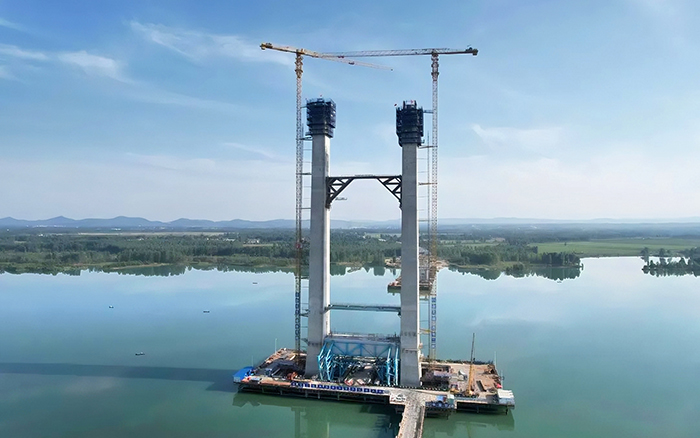 大橋主塔采用“H”型造型結(jié)構(gòu),總高度201米,XGT360-20S1、XGT7528A-18S1屹立在大橋兩側(cè)肩負主要吊裝工作,滿勤作業(yè)、高效運轉(zhuǎn),保障高空對接安全,雙塔協(xié)力頻頻突破重要建設(shè)節(jié)點。