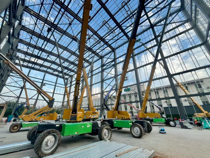 多臺設備組成的"綠色戰(zhàn)隊"展現(xiàn)出強大的協(xié)同作業(yè)能力,其靈活的轉向模式和強大的通過性在密集的鋼構件中穿梭自如,大幅提升了焊接安裝的效率,為這項重點工程的順利推進提供了強有力的高空保障。