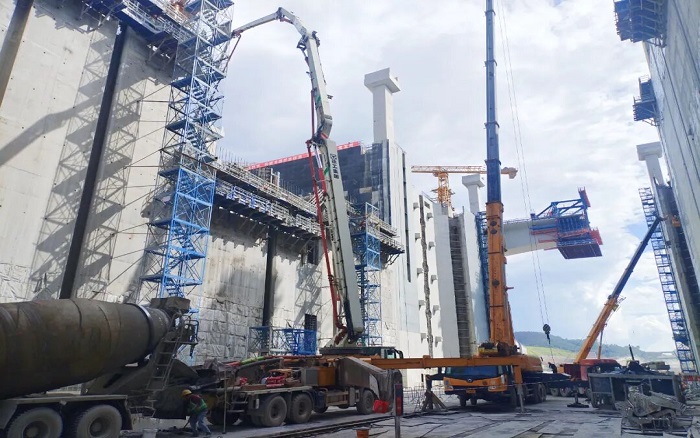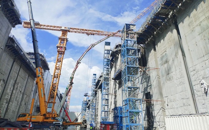 閘門(mén)立柱高聳入云,澆筑精度要求堪比“云端繡花”。徐工泵車(chē)、起重、塔機(jī)成套化裝備舉重若輕,天塹之間“穿針引線”!