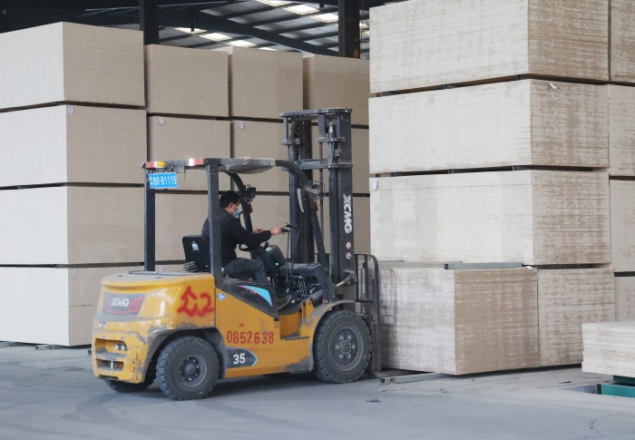 在山東菏澤某大型板材廠內(nèi),二十余臺徐工鯤鵬叉車、新E叉車組成的"黃金戰(zhàn)隊",以高效穩(wěn)定的作業(yè)表