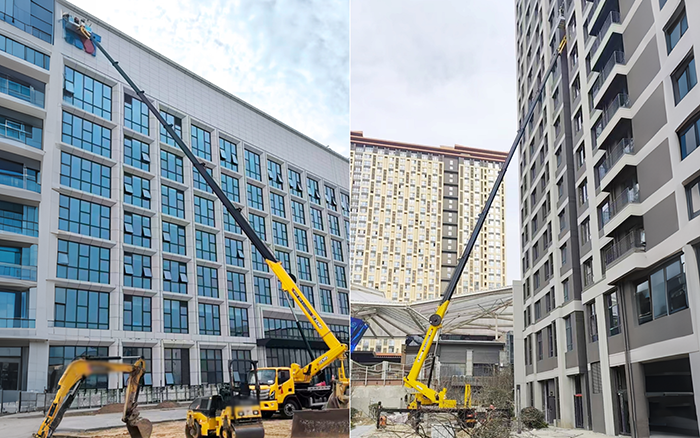 高層樓宇外側(cè)飄窗突出結(jié)構(gòu)密集分布,對高空作業(yè)的精準度和靈活性要求極高。傳統(tǒng)設(shè)備因臂架笨重、跨障能力弱,難以精準抵達作業(yè)點位,施工進度頻頻受阻。而徐工 GKS45A 搭載“基本臂 + 六節(jié)伸縮臂 + 獨立飛臂” 創(chuàng)新結(jié)構(gòu),緊湊靈動的小飛臂如同精準的 “高空畫筆”,輕松繞開各類障礙物,穩(wěn)穩(wěn)定格每一個作業(yè)位置,完美匹配新樓施工的嚴苛需求。