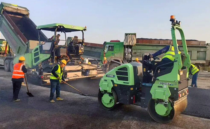 在河北道路施工中,徐工RP905HEV混動攤鋪機與XD120EP純電壓路機組成“新能源搭檔”。