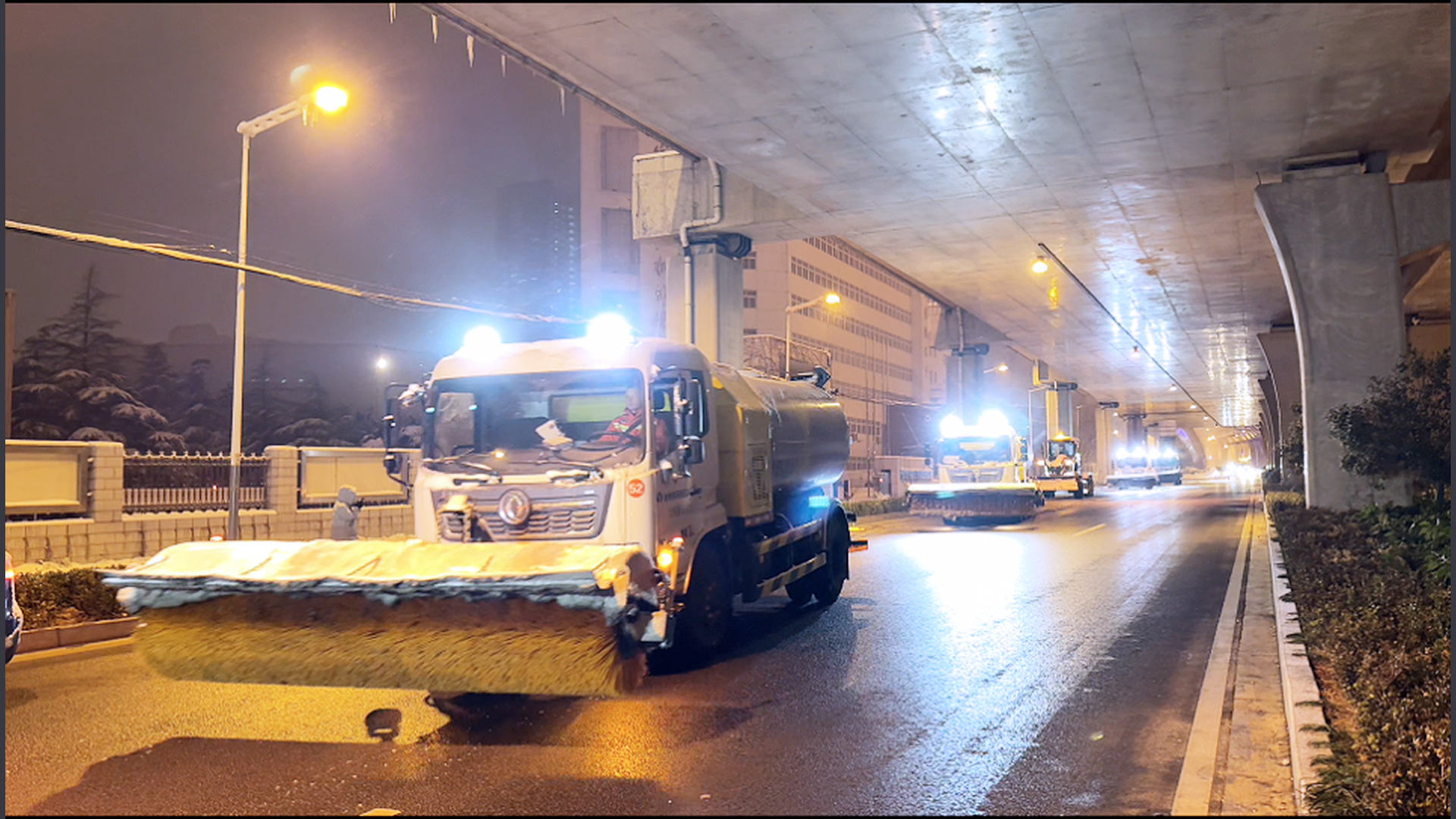 1月20日0點(diǎn),徐工除雪設(shè)備和救援隊(duì)在徐州東三環(huán)快速路集結(jié),對(duì)整條三環(huán)高架道路除雪,保障清晨的正常通行。