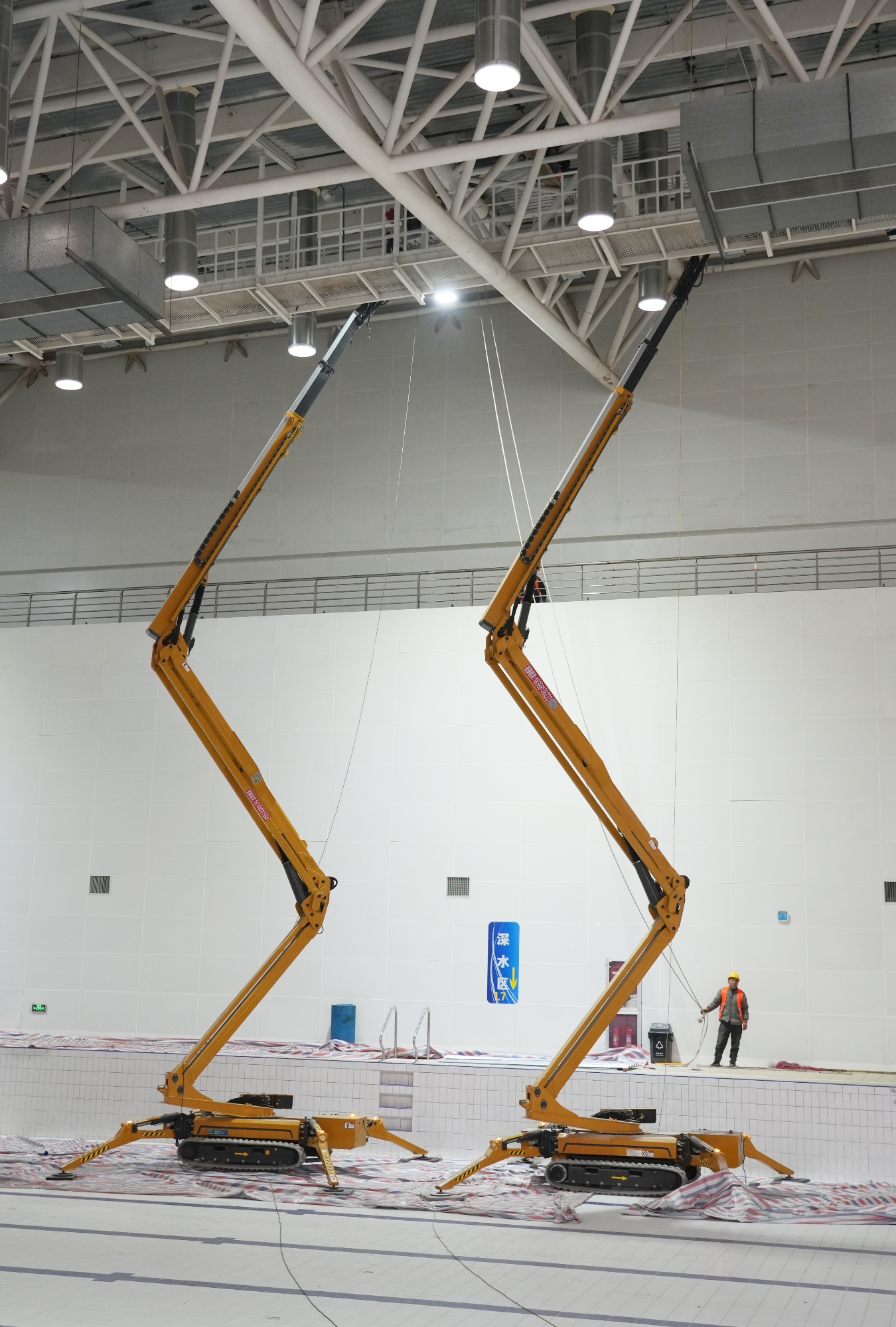 據(jù)悉,該項(xiàng)目策劃伊始,便遇到兩大難題:場(chǎng)地狹窄,入口寬1m高20m,且場(chǎng)館下方為地下車庫(kù),地面承重低,普通臂車無(wú)法進(jìn)場(chǎng);若采用傳統(tǒng)腳手架,需滿架搭建,成本高且工期長(zhǎng)。面對(duì)如此工況,徐工XGA26X-Li蜘蛛車精準(zhǔn)破局,成為受限空間施工核心利器。