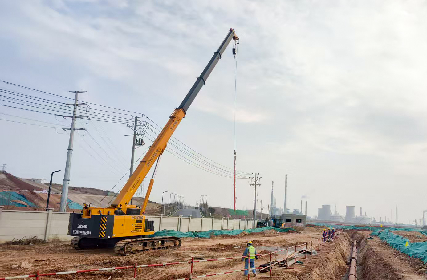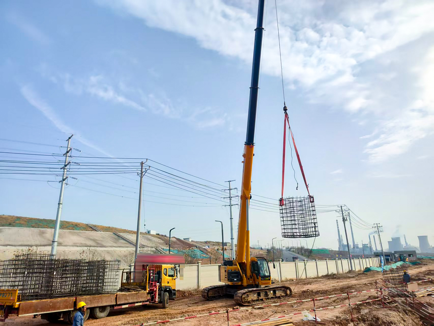洛陽(yáng)百萬(wàn)噸聚乙烯項(xiàng)目基礎(chǔ)施工現(xiàn)場(chǎng),XGTC30L5(30噸級(jí))伸縮臂履帶起重機(jī)正承擔(dān)著關(guān)鍵工序——鋼筋籠吊裝。