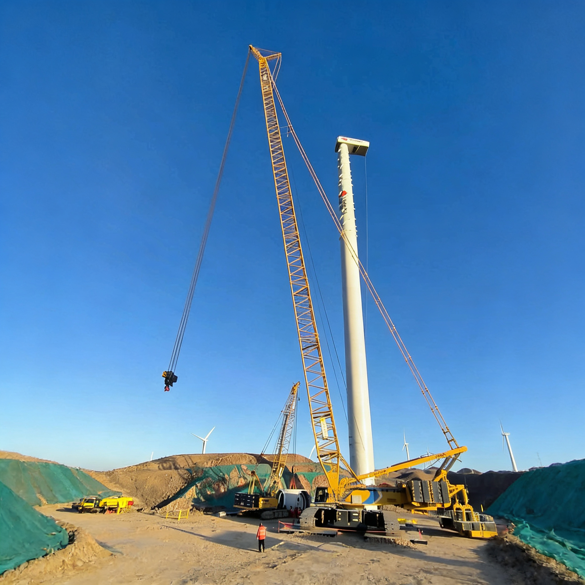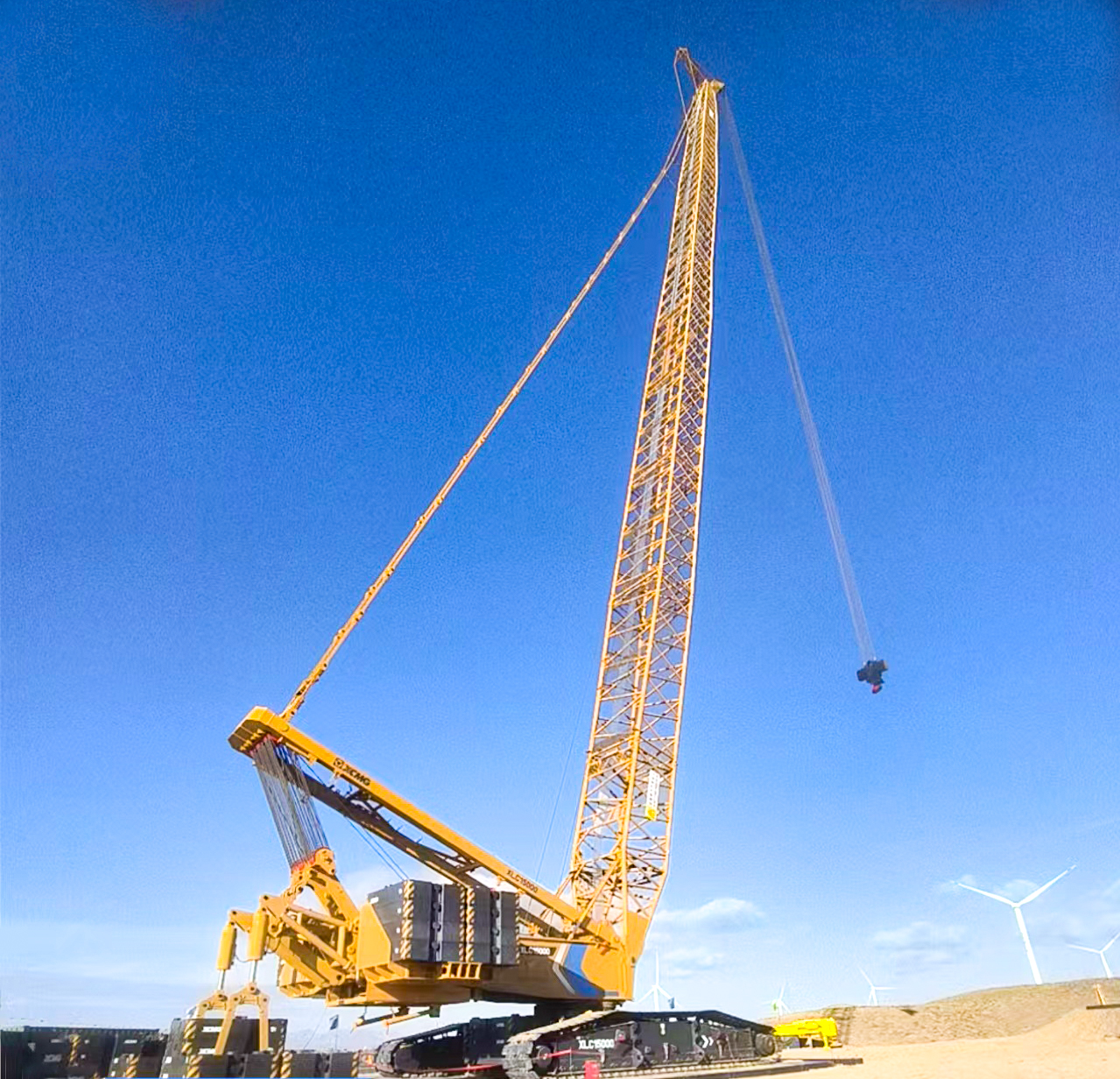 XLC15000采用超起工況,將130噸機(jī)艙穩(wěn)穩(wěn)送至百米高空,吊鉤動態(tài)防擺技術(shù)悄然發(fā)力,重物如被無形的手托穩(wěn),毫米級精準(zhǔn)對接塔筒法蘭,風(fēng)沙難擾分毫。
